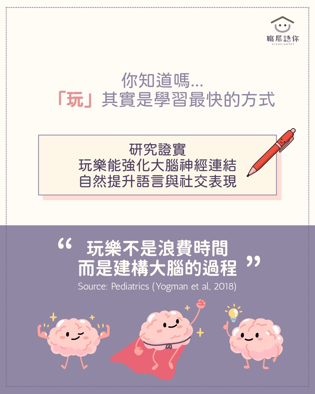 根據美國兒科學會 (AAP) 在 Pediatrics 期刊發表的報告 (Yogman et al., 2018),遊戲並非時間的浪費,而是建構大腦架構的關鍵過程。