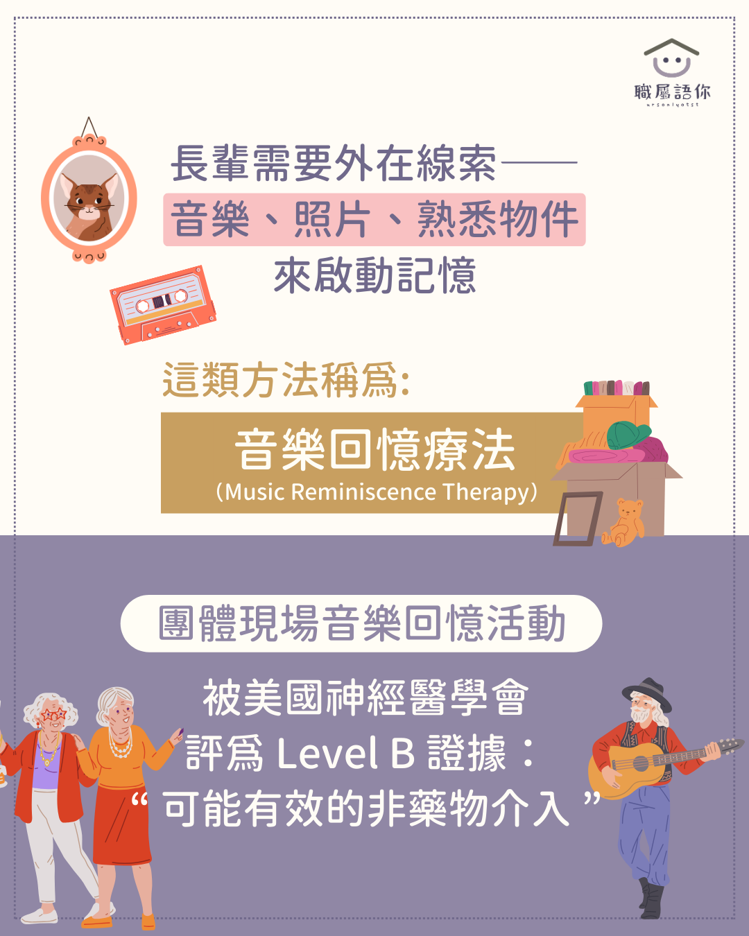 對於失智長者而言,我們需要透過外在線索以及感官刺激來啟動記憶,如音樂、照片、熟悉物件,這類方法在國際上稱為音樂回憶療法(Music Reminiscence Therapy)。