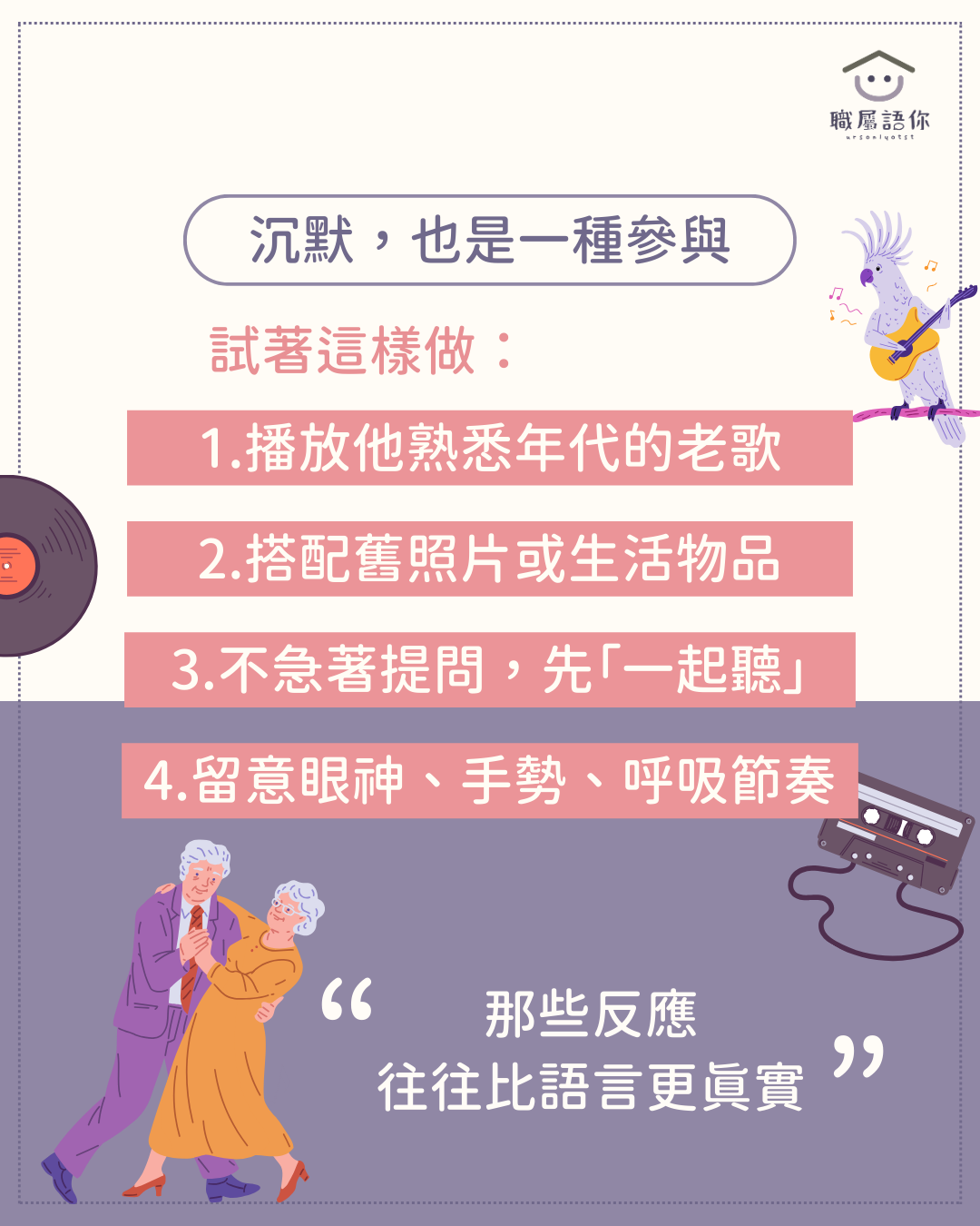 ——這些小細節其實往往比言語更真實,如果身為照顧家人的你們,面對失智症長輩還不知道可以怎麼辦的話,不妨跟著職屬語你的小方法一起試試看吧!
