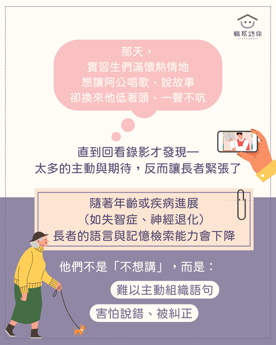 過去被提醒或糾正太多次,會讓長輩對開口說話產生壓力與焦慮,進而選擇沈默以避免挫折。 - 無法即時理解他人的談話節奏